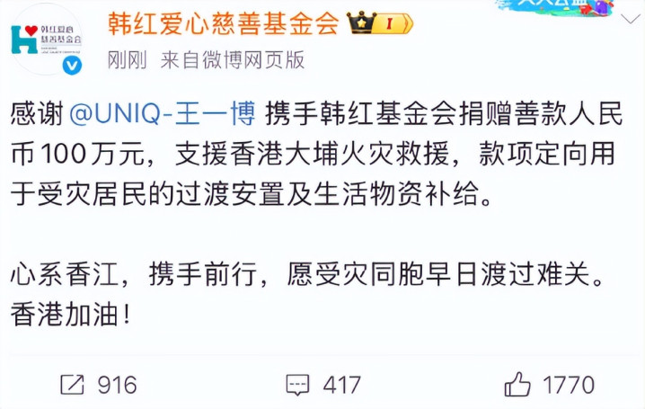 他从不爱惜手中的"0",在公益领域始终低调前行,11月香港大埔突发火灾,灾情紧急,各方尚在观望时,王一博已第一时间联合韩红基金会,默默捐出100万元。